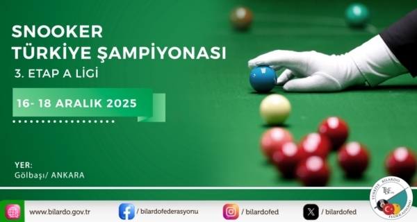 2025 Türkiye Snooker Şampiyonası A Ligi 3. Etap 16-18-18 Aralık 2025 Tarihleri arasında Gölbaşı/ Ankara'da yapılacaktır.