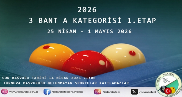 Federasyonumuzun 2026 yılı faaliyet programında yer alan 3 Bant Erkekler A Kategorisi Türkiye Şampiyonası 1.Etap müsabakaları 25 Nisan - 1 Mayıs 2026 tarihleri arasında Türkiye Bilardo Federasyonu Bilardo Tesisi Gölbaşı/Ankara’da yapılacaktır. Son başvuru tarihi 14 Nisan 2026 saat 21:00 olup, başvuruların bitiminde gruplar ve maç programları yayınlanacaktır.