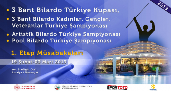 19 Şubat- 3 Mart tarihleri arasında Antalya'da düzenlenecek olan 3 Bant Bilardo Türkiye Kupası, Gençler-Kadınlar- Veteranlar ve Artistik Bilardo Türkiye Şampiyonaları katılım başvuruları 17 OCAK - PERŞEMBE günü Saat:13:00'de sitemizden açılacaktır.