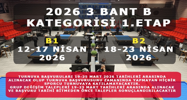 12-23 Nisan 2026 tarihleri arasında TBF Gölbaşı / ANKARA tesisinde düzenlenecek olan Türkiye 3 Bant Bilardo Şampiyonası B Kategorilsi 1. Etap başvuruları 19-25 Mart 2026 tarihleri arasında alıncaktır.