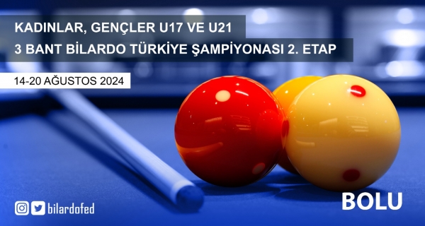 Federasyonumuzun faaliyet programında yer alan Kadınlar ve Gençler Türkiye Şampiyonaları 2.Etabı 14-20 Ağustos 2024 tarihleri arasında Bolu GSM Bilardo Tesisi'nde yapılacaktır. Tüm kategorilerin open(açık katılım) olarak yapılacaktır. Başvurular 15.07.2024 saat 23:59'da kapatılacak ve bu tarihten sonra gelen başvurular yedek olarak alınacaktır. Turnuva şekli ve kategorilerin maç günleri başvuruların bitiminden sonra kesinlik kazanacak ve turnuva talimatnamesi ile yayınlanacaktır.