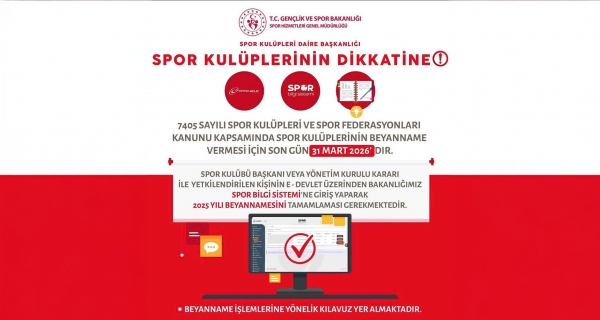 7405 sayılı Kanun kapsamında, spor kulüplerimizin “2025 Yılı Beyannamelerini” vermeleri için son gün 31 Mart 2026.