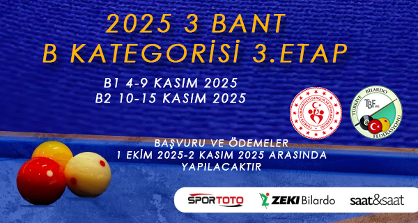 4-15 Kasım 2025 tarihleri arasında TBF Gölbaşı / ANKARA tesisinde düzenlenecek olan Türkiye 3 Bant Bilardo Şampiyonası B Kategorilsi 3. Etap başvuruları 1 Ekim-2 Kasım tarihleri arasında alıncaktır.